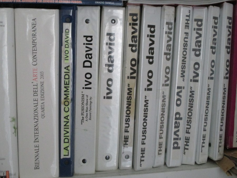 Books on the life of fine artist Ivo David and the Fusionism artistic movement he founded are displayed in the artist’s studio.