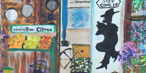 Artist Ella Chabot, creator of GetShotByElla.com, is honored to have five paintings displaying in the Olde Florida Stories While Sipping at the Indian River Distillery, 3308 Aviation Boulevard, Vero Beach, Florida, Thursday, November 20, 2025 through Thursday, February 26, 2026. Pictured Inspired Impressions of Indian River Citrus, acrylic on canvas. Other works featured by Chabot include Artistry, Artist’s Tree, acrylic on canvas, Enchanted Florida, oil on canvas, Indian River Gold, Peterson’s Groves, acrylic on canvas, and Time Passes at Royal Park Arcade/Parkway Plaza, acrylic on canvas.